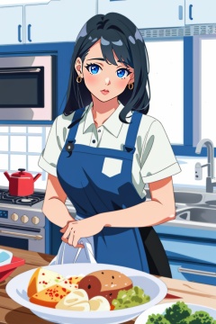 ((HRD, HUD, 8K)),((masterpiece, best quality)), highly detailed, soft light,1 girl, gink skirt, white skirt, plaid skirt,wearing an apron, cooking, in the kitchen,