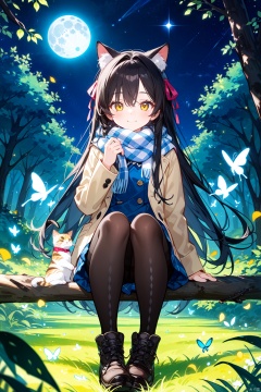 1girl, cat, solo, long hair, pantyhose, scarf, black hair, butterfly, sitting, nature, bug, argyle, night, forest, tree, moon, breath, smile, yellow eyes, hair bow, boots, bow, dress, full moon, brown eyes, black pantyhose, argyle legwear, hair ribbon, ribbon,half closed Eyes, backlight, msn, colors