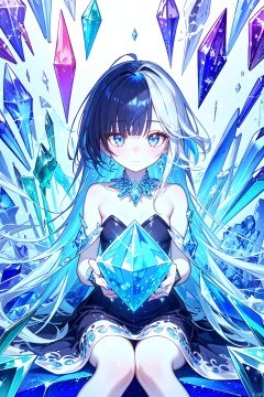 masterpiece, best quality, masterpiece,best quality,official art,extremely detailed CG unity 16k wallpaper,masterpiece, ((1girl)),(science fiction:1.1), (ultra-detailed crystallization:1.5), (crystallizing girl:1.5), kaleidoscope, ((iridescent:1.5) long hair), (glittering silver eyes), sitting, surrounded by colorful crystals, blue skin, (skin fusion with crystal:1.8), looking up, face focus, simple dress, transparent crystals, flat dark background, lens flare, prism,