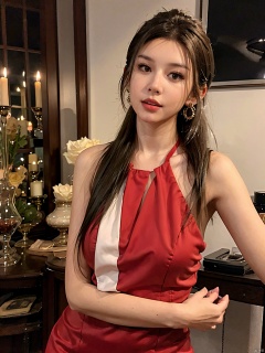 1, 1girl, long hair, brown hair, solo, dress, brown eyes, looking at viewer, holding, red dress, parted lips, bare shoulders, indoors, lips, upper body, sleeveless, ((poakl))