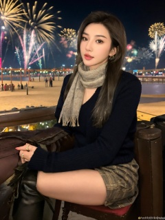 1girl,fashion model,female focus,(masterpiece, realistic, best quality, highly detailed, profession),asian,pretty,Charming eyes,exquisite facial features,bangle,sweater,scarf,skirt,black stockings,boots,sitting,night,neon,beach of city,new year,cinematic composition,,blurry,plns,sw, fireworks, hand101