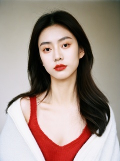 film grain analog photography,1girl, asian woman red sweater white top, soft flawless pale skin, open v chest clothes, female chinese idol portrait, square-shaped neckline, 20 years old, thin coat, glossy lips,