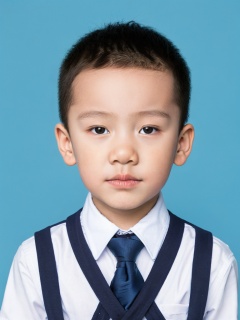 child boy, young boy vest tie, chinese boy, relaxed blue background, hyperdetailed portrait, symmetrical front view, girl wearing uniform, realistic professional photo, big nose, best quality, portrait,best quality,masterpiece,