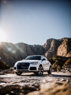 futuristic audi-branded rover dominates foreground, white metallic frame contrasts rugged, rocky terrain, rover' design sleek prominent audi rings side, scientific instrumentation atop, lens flare effect upper center casts warm glow creates,best quality,masterpiece,
