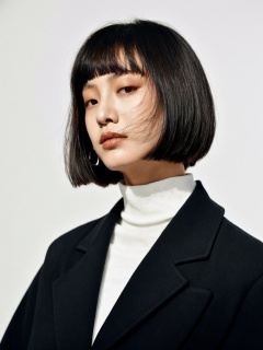 young asian woman, mid-length dark hair, bob haircut, subtle makeup, natural look, pensive expression, side glance, white turtleneck, oversized black jacket, simple silver hoop earring,best quality,masterpiece,