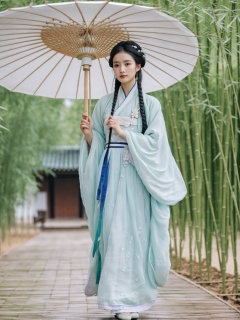 woman blue chinese hanbok holding parasol, best quality, cinematic beautiful natural skin, white hanfu, song dynasty, pastel green color, casual clothing, swan, cape, bamboo, award,best quality,masterpiece,