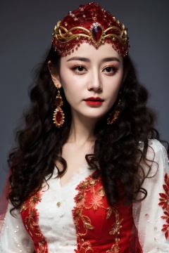 PHOTOREALISTIC REALISTIC,masterpiece,best quality,highres,ultra detailed,8k,1woman,strobe lighting,portrait,white skin, xinjiang red costume suit look,xinjiang red veil tiara,xinjiang white long frilled sleeves shirt,xinjiang red vest,xinjiang curly hair,xinjiang earrings,xinjiang costume makeup,
