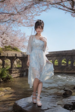 realistic, photorealistic, (best quality, masterpiece, ultra high resolution, 4K, HDR, photo), dark shot, (photo of portrait:1.2), 1girl, solo, smile, looking at viewer, long black hair, Full-body photos,(wearing a red Chinese wedding dress:1.4), (an ancient bride adorned with gold hairpins and silver jewelry), an extremely delicate and beautiful,real person, fair skin,((long legs)), plentiful,breasts,(see-through:1.2) (colorful:1.2), (floral print:1.2), (Standing on a stone bridge:1.4), (Cherry blossoms fluttering in the wind:1.3),dynamic pose,  colorful cloud, incredible beautiful sky, dynamic Angle,  bokeh, Under the sunlight during the day,(Black suspender stockings:1.2) (( perfect long legs)), (Perfect hands:1.4),(blackpantyhose:1.2)