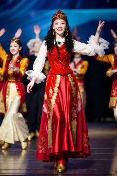 PHOTOREALISTIC REALISTIC,masterpiece,best quality,highres,ultra detailed,8k,dilireba, 1woman, xinjiang red costume suit look, xinjiang red veil tiara, xinjiang white long frilled sleeves shirt, xinjiang red vest, xinjiang curly hair, xinjiang red long skirt, xinjiang earrings, xinjiang costume makeup, xinjiang golden high heel boots, stage, dance perform, xinjiang traditional, dance pose, surround by actor group, dancer group, show, crowd, looking at viewer, solo focus, standing, full body, smile, white skin, depth of field, realistic, blurry background,
