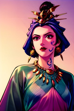 yuanshen, 1girl, solo, jewelry, earrings, necklace, headdress, tattoo, brown eyes, lipstick, makeup, facepaint, hair ornament, tribal, looking down, tattoo,nice hands,