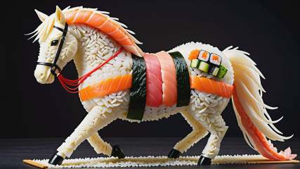 <lora:SushiStyleXL:1>SushiStyle noble guardian horse, made out of sushi, sashimi, rice, (japanese:0.5), crafted with sushi, (Masterpiece:1.3) (best quality:1.2) (high quality:1.1)
