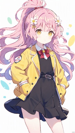 (best quality), ((masterpiece)),loli),(petite),Pink hair,Yellow eyes, (red Jacket),high ponytail,white collared shirt,hair flower,fipped hair,floating hair,Frown,hands in pockets,black dress,red bowtie