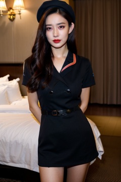 PHOTOREALISTIC REALISTIC,masterpiece,best quality,highres,ultra detailed,8k,1woman,cowboy shot,arms behind back,strobe lighting,stewardess outfit,stewardess hat,crying,teers,makeup,lipstick,hotel room, <lora:mengziyi_alexnsfw5.0:0.6>