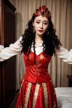 PHOTOREALISTIC REALISTIC,masterpiece,best quality,highres,ultra detailed,8k,dilireba, 1woman, xinjiang red costume suit look, xinjiang red veil tiara, xinjiang white long frilled sleeves shirt, xinjiang red vest, xinjiang curly hair, xinjiang red long skirt, xinjiang earrings, xinjiang costume makeup,looking at viewer, dancing,open arms,cowboy shot, crying, white skin, hotel room,bed,strobe lighting,