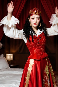 PHOTOREALISTIC REALISTIC,masterpiece,best quality,highres,ultra detailed,8k,dilireba, strobe lighting,1woman,crying,tears, xinjiang red costume suit look, xinjiang red veil tiara, xinjiang white long frilled sleeves shirt, xinjiang red vest, xinjiang curly hair, xinjiang red long skirt, xinjiang earrings, xinjiang costume makeup,looking at viewer, dancing,open arms,cowboy shot,white skin, hotel room,bed,