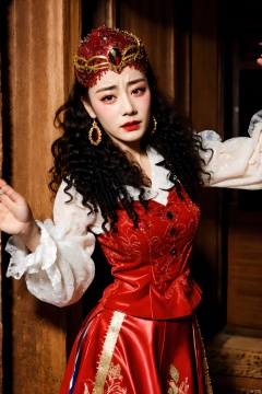 PHOTOREALISTIC REALISTIC,masterpiece,best quality,highres,ultra detailed,8k,dilireba, strobe lighting,1woman,crying,tears, xinjiang red costume suit look, xinjiang red veil tiara, xinjiang white long frilled sleeves shirt, xinjiang red vest, xinjiang curly hair, xinjiang red long skirt, xinjiang earrings, xinjiang costume makeup,looking at viewer, dancing,open arms,cowboy shot,white skin, hotel room,bed,