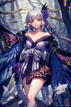 Simple background,,Outside, in the forest, by a lake,((lying)),lying in the water,,1girl, solo, looking at viewer, twintails,,smile, seductive smile, grey hair, hair ornament, long hair, light purple hair, bell, bangs, red eyes, beautiful detailed eyes, light red eyes, bare shoulders, collarbone, breasts, cleavage, japanese clothes, kimono, (winged arms), feathers, perfect female body, neat figure, slender waist, wide hips, slim legs<lora:EMS-314005-EMS:1.000000>, <lora:EMS-93-EMS:0.500000>, <lora:EMS-4468-EMS:0.500000>
