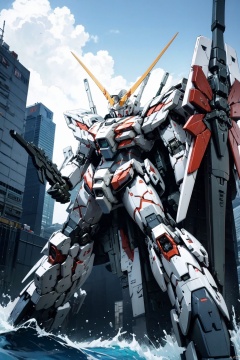 best quality, mecha, red mecha with white lines and golden weapon, fighting pose, city in background, sea, water, kaiju, mecha fighting a kaiju, destoryMode