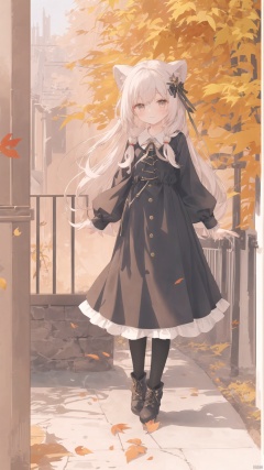 1girl, acorn, anger_vein, animal_ears, autumn, autumn_leaves, bangs, black_legwear, black_skirt, blush, boots, brown_eyes, brown_skirt, capelet, day, eyebrows_visible_through_hair, falling_leaves, forest, frilled_skirt, frills, ginkgo_leaf, hair_ornament, hair_ribbon, holding_leaf, hood, hood_down, hooded_capelet, kneehighs, leaf, leaf_background, leaf_hair_ornament, leaf_on_head, leaf_print, little_red_riding_hood_\(grimm\), long_sleeves, looking_at_viewer, maple_leaf, nature, outdoors, pleated_skirt, red_capelet, ribbon, shirt, shoes, skirt, solo, spoken_anger_vein, squirrel, standing, tail, thighhighs, tree, white_shirt, wolf_ears, wolf_girl, wolf_tail