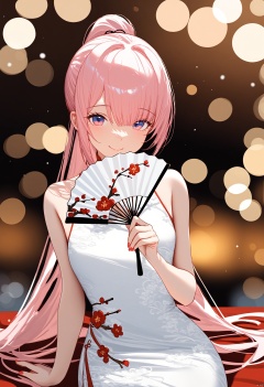 1girl, solo,pink hair, long hair, ponytail,long hair,shy, meaningful smile, white china dress, sleeveless dress, looking at viewer, half-open eyes, holding a fan, fan covering mouth, plum blossoms, sitting, bokeh, blurry background, close up,