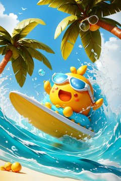Coconut trees,bubbles,beaches,birds,bubbles,clouds,sky,head glasses,goggles,leaves,lemons,ocean,open mouth,outdoors,palm trees,partial underwater footage,plants,sky,sunglasses,water,water drops,<lora:冲浪芒果:0.75>,
