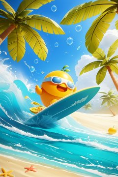 Mangoes,surfboards,coconut trees,bubbles,beach,blue sky,depth of field,bubbles,fish,horizon,leaves,ocean,Open Mouth,outdoors,palm trees,plants,potted plants,sand,clouds,trees,water drops,Masterpiece,16k,<lora:冲浪芒果:0.6>,