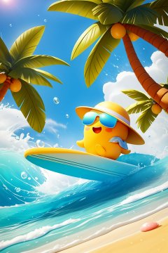 Sun hat, surfboard, coconut tree, bubble, beach, blue sky, depth of field, horizon, leaves, ocean, Open mouth, outdoors, palm tree, plant, flowerpot, sand, cloud, tree, water drop, Masterpiece, 16k, vr glasses, cape, Spray, lounge,<lora:冲浪芒果:0.6>,