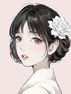 <lora:xl_水墨(kohaku_delta)2-000009:1>,ink wash painting,shuimo style,1girl, solo, flower, short hair, hair ornament, hair flower, rose, monochrome, parted lips, simple background, pink background, portrait, lips, eyelashes, face, white rose, bangs, white flower, masterpiece, best quality,