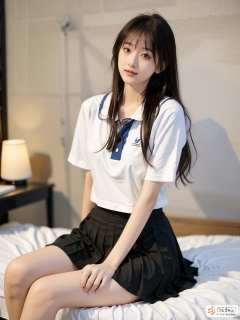 Enhanced, masterpiece, 16K, JK, 1 girl, long hair, school uniform, skirt, sitting on bed,:), Light master