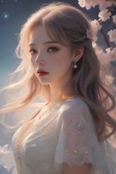 (masterpiece), (best quality), (ultra-detailed), (illustration), 1girl, mixed-blood, stars in the eyes, cherry blossoms, messy floating hair, crystal earrings, colored inner hair, Starry sky adorns hair, (colorful Bubble), (pearl), (Galaxy), depth of field, upper body, lace-trimmed dress, Gauze Skirt