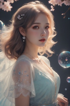 (masterpiece), (best quality), (ultra-detailed), (illustration), 1girl, mixed-blood, stars in the eyes, cherry blossoms, messy floating hair, crystal earrings, colored inner hair, Starry sky adorns hair, (colorful Bubble), (pearl), (Galaxy), depth of field, upper body, lace-trimmed dress, Gauze Skirt