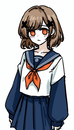 solo, 1girl, sleeves past wrists, school uniform, sleeves past fingers, skirt, simple background, bangs, hair ornament, serafuku, white background, short hair, parted lips, pleated skirt, long sleeves, muted color, neckerchief, brown hair, sailor collar, black skirt, blunt bangs, cowboy shot, orange eyes, black sailor collar, looking at viewer