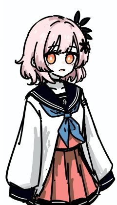 solo, 1girl, sleeves past wrists, school uniform, sleeves past fingers, skirt, simple background, bangs, hair ornament, serafuku, white background, short hair, parted lips, pleated skirt, long sleeves, muted color, neckerchief, pink hair, sailor collar, black skirt, blunt bangs, cowboy shot, orange eyes, black sailor collar, looking at viewer