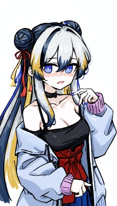 1girl, solo, breasts, multicolored hair, cleavage, hair bun, blue eyes, sleeves past wrists, long hair, looking at viewer, bangs, upper body, double bun, hands up, blue hair, simple background, hair between eyes, off shoulder, parted lips, purple nails, long sleeves, signature, streaked hair, blush, bare shoulders, medium breasts, collarbone, cardigan, open clothes, nail polish, purple hair