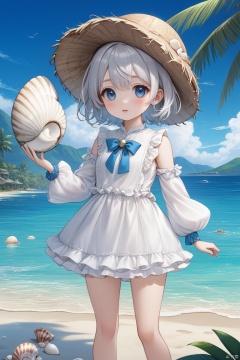 (Girlish body type), (masterpiece), (best quality), Exquisite visuals, high-definition, (ultra detailed), finely detail, ((solo)), (white Silver hair), (gradient Blue), (beautiful detailed eyes), Kawai, loveliness, ,standing, ((full body)),a slightly shy little shell with short white hair, anthropomorphic shells,a center cut, (child:1.2), wearing a white shell outfit and a swimming ring. (((Shell clothes and hats))),The environment is next to the beach, with coconut trees and many seashells on the beach
