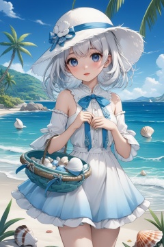 (masterpiece), (best quality), Exquisite visuals, high-definition, (ultra detailed), finely detail, ((solo)), (white Silver hair), (gradient Blue), (beautiful detailed eyes), Kawai, loveliness,standing, ((full body)),a shell with short white hair, anthropomorphic shells, wearing a white shell outfit and a swimming ring. (((Shell clothes and hats))).The environment is next to the beach, with coconut trees and many seashells on the beach
