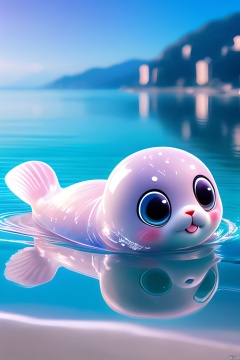 A cute seal, it has a pair of pious big eyes, pink translucent PVC body, cute translucent tail, floating in the air, holding a microphone, carrying a guitar, spotlights, festival lights, Sanya landscape, beach, sea, waves, starry sky<lora:EMS-314243-EMS:0.500000>