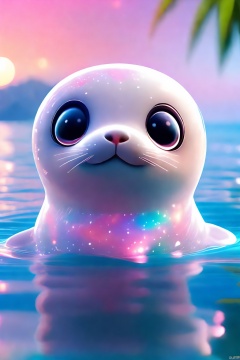 Adorable baby pink seals on the beach, with a translucent body with a pale pink circle around their body, (with many small colorful garlands on their heads), dancing merrily under the coconut trees.Background is sunset, sea, waves, coconut trees,