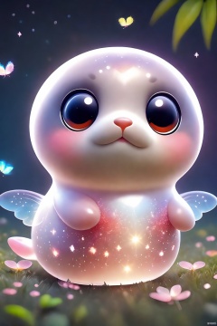 A cute baby seal, translucent body, starry sky, (many butterflies), flowers, grass, tropical forest