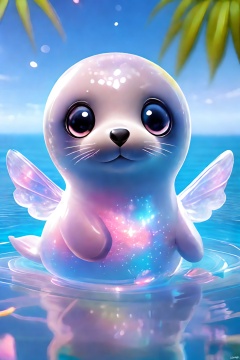 An adorable image of a seal with large, godly eyes, a pink body, and transparent wings. Swimming freely in the blue sea, surrounded by colorful corals and a variety of marine life. The sun shines through the sea water and spreads on the dolphins, creating beautiful light and shadows.