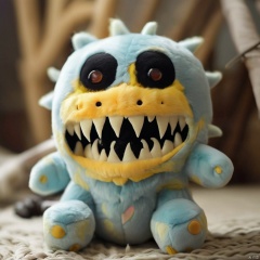 stuffed-toy, no humans, teeth, horror \(theme\), sharp teeth, solo, blurry, open mouth, stitches, yellow eyes, monster, full body, blurry background, looking at viewer