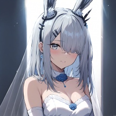 (masterpiece), (best quality), 1girl, rabbit ears,hair ornament,hair clip,grey hair, long hair,grey eyes, hair over one eye,scar on nose,medium_breasts,frostnova,wedding_dress,white_gloves,wedding,blue_necklace,white_elbow_gloves,wedding_veil,looking_at_viewer,sunlight,sunny_days,portrait,