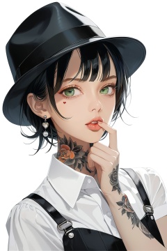 beautiful lady, realistic, raw photo, black hair, black headwear, boots, collared shirt, dress shirt, earrings, green eyes, hand up, hat, heart, heart tattoo, jewelry, looking at viewer, male focus, mouth hold, orange eyes, shirt, short sleeves, sidelocks, simple background, solo, tattoo, upper body, white background, white shirt
