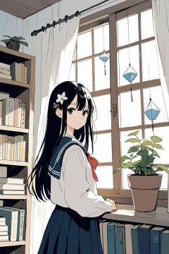 1girl, cute illustration, cute, kawaii, sweet,rough sketch, film grain, noise, , black eyes, black hair, book, book stack, bookshelf, buttons, closed mouth, curtains, day, dutch angle, hair between eyes, hair ornament, indoors, long hair, long sleeves, looking at viewer, plant, potted plant, school uniform, serafuku, solo, very long hair, window, wind chime