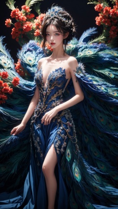 1girl, dress, solo, black hair, bare shoulders, blue dress, hair ornament, flower background, breasts, hair bun, looking at viewer, strapless, strapless dress, standing, red lips, feathers, peacock feather, flower, collarbone, tiara,<lora:Again_Style:1>