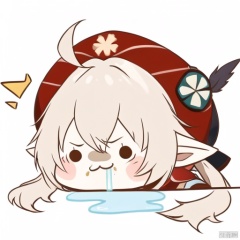 drooling, 1girl, chibi, klee \(genshin impact\), solo, hat, simple background, white background, ahoge, bangs, :3, red headwear, cabbie hat, twintails, long hair, hair between eyes, pointy ears, hat feather, low twintails, clover print, sidelocks, light brown hair, looking at viewer, hat ornament, v-shaped eyebrows, food on face