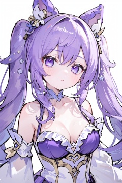 1girl, bare_shoulders, braid, breasts, cleavage, collarbone, dress, frilled_sleeves, frills, hair_cones, hair_ornament, keqing_\(genshin_impact\), long_hair, looking_at_viewer, medium_breasts, purple_eyes, purple_hair, solo, twintails, upper_body
