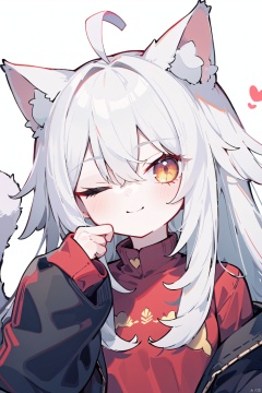 artist:tianliang duohe fangdongye,1girl, solo, long hair, looking at viewer, smile, bangs,yellow eyes, simple background, shirt, long sleeves, white background, animal ears, hair between eyes, very long hair, closed mouth, tail, upper body, ahoge, white hair, heart, one eye closed, puffy sleeves, cat ears, hand up, cat tail, animal ear fluff, sleeves past wrists,red shirt, cat girl, puffy long sleeves, ;\),red sweater,black jacket,sideways