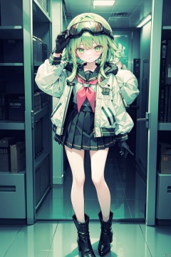 artist:tianliang duohe fangdongye,1girl, black_footwear, black_gloves, boots, eyewear_on_head, gloves, goggles, goggles_on_head, green_eyes, green_hair, gumi, high_heel_boots, high_heels, long_hair, pleated_skirt, power_lines, sailor_collar, serafuku, short_hair_with_long_locks, skirt, song_name