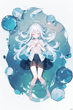 artist:tianliang duohe fangdongye,best illustration,(colorful),(from above:1.4),((close up)),(1girl:1.2),(lying_on_water:1.2),(floating on water),full body,(beautiful and delicate face),(beautiful long white hair),(very long white hair),closed eyes,small breasts,(black pleated skirt:1.25), (facing up), water background,(reflective water surface),(flouds in water :1.4),(clouds in water),water with feathers, masterpiece, 1girl,((white hair)),(collared shirt),(white stocking),solo,collarbone,slim legs,(hand on own chest), (water background:1.2),